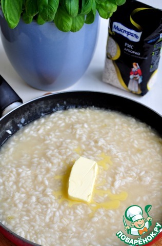 На фото нужная нам кремовая консистенция ризотто. Когда рис будет готов, добавить сливочное масло, хорошо перемешать чтобы оно полностью растворилось.