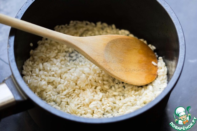 Всыпаем его к маслу и немного обжариваем, около 1-2 минуты. Я готовила ризотто без вина. Но если вы хотите его добавить, то это необходимо сделать сразу после обжарки. Когда вино полностью впитается в рис, можно приступать к дальнейшему приготовлению.