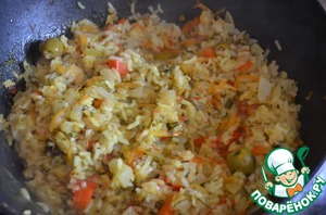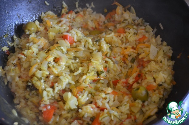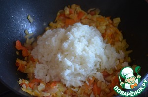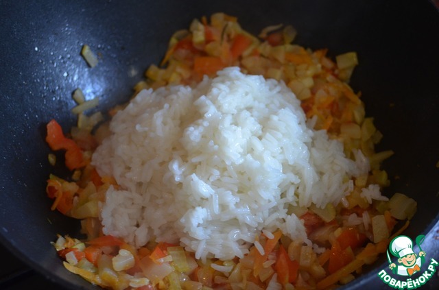 • Добавляем рис и бульон (либо-обычную воду). Для овощной паэльи отлично подходит картофельный бульон. Попробуйте.