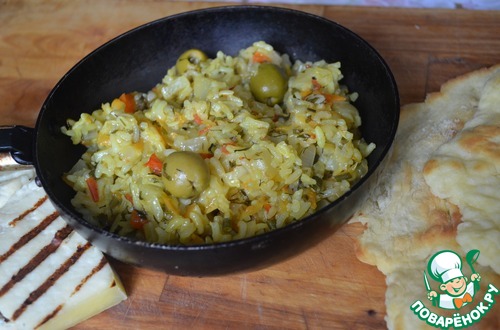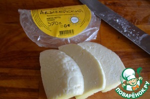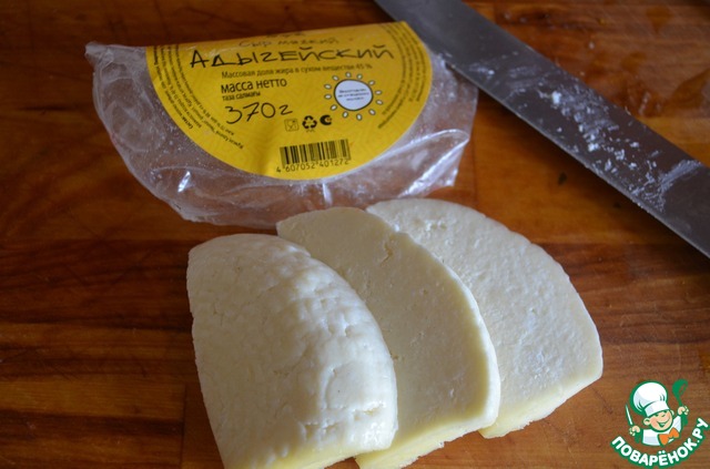 • Паэлью рекомендую Вам пробовать с жареным сыром и лепешками. Приготовление их не займет у Вас много времени. Вкусный жареный греческий сыр халуми нам отлично заменит адыгейский сыр. Нарезаем его на порционные кусочки толщиной около 1см.