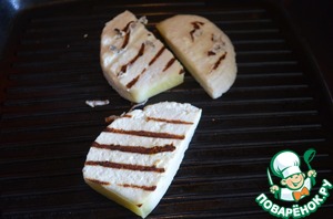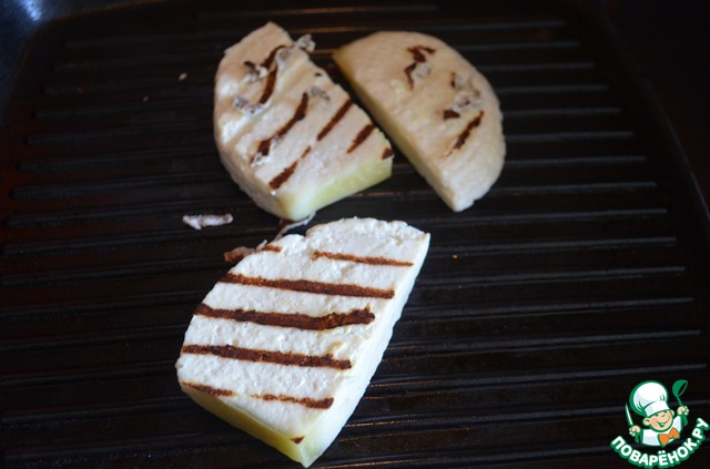 • Обжариваем его на горячей сковороде гриль без масла. Можно слегка обвалять в муке или крахмале, но, в принципе, он жарится отлично и просто так. Три минуты и отменный жареный сыр к паэлье готов.