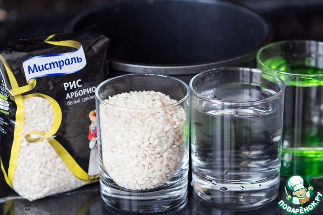 Для приготовления риса потребуется стакан риса и два стакана воды. Кстати, в Итальи для приготовления аранчини часто используют оставшееся с ужина ризотто.