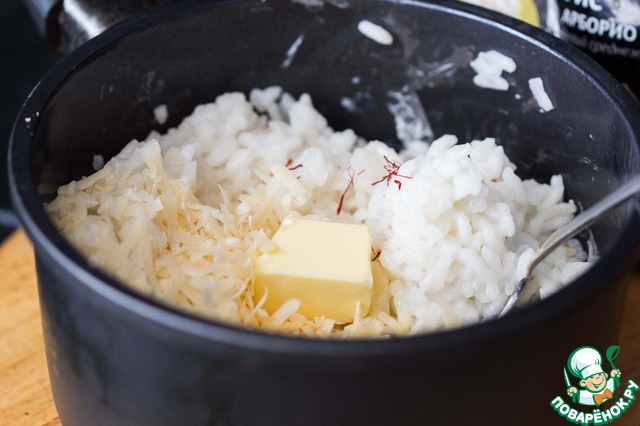 Когда рис будет готов, добавляем в него сливочное масло, натертый сыр и шафран. Для того, чтобы шафран равномерно окрасил рис, можно его замочить в небольшом количестве воды на 10 минут и затем влить её в рис. Тщательно перемешиваем рис и даем ему стыть.