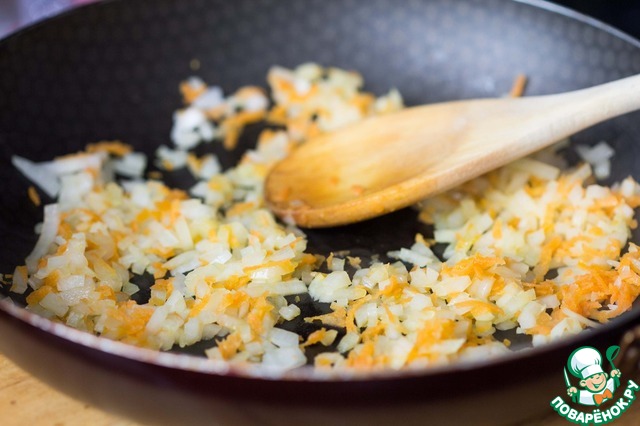 В сковороде разогреваем оливковое масло и обжариваем на нем лук и морковь пару минут.