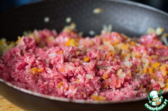 Добавляем фарш и измельчаем его ребром лопатки. Обжариваем все вместе 7-10 минут до небольшой румяности мяса.