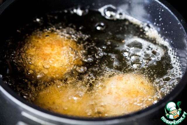 В сотейнике разогреваем масло. Оптимальная температура масла для обжаривания аранчини во фритюре от 170-180С. Я достигла нужной температуры с помощью кулинарного градусника. Если у вас его нет, понять достаточно ли разогрелось масло можно с помощью воды. Капните немного воды в масло. Капелька должна пошипеть и испариться. Если же вы слышите сильный треск и капля не уходит, значит масло ещё недостаточно нагрето. Если масло стало дымить и неприятно пахнуть, значит вы его нагрели слишком сильно.