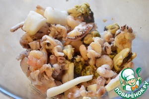 Отварить морской коктейль в соленой воде. Я отваривала 1 минту после закипания. Воду от морского котейля слить.