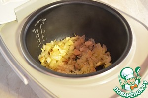 Включить мультиварку в режим "Жарка", растопить сливочное масло, выложить репчатый лук порезанный маленькими кубиками и чеснок порезаный кружочками, посыпать сахаром. Обжаривать до прозрачного состояния.