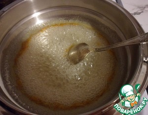 Соединим воду, сахар и лимонную кислоту и проварим на среднем огне до золотистого цвета. Обычно достаточно 8-10 минут.