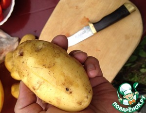 Пока курдюк топится, ведём подготовительные работы, моем молодой картофель и делаем в нём надрезы. Не перестарайтесь с глубиной, что бы ваш картофель не развалился на куски потом.