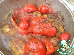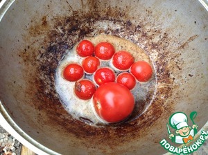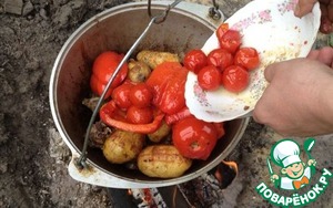 Закидываем помидоры. Желательно что бы они были на поверхности. Не получится - ничего страшного, вкус они дадут, а пара-тройка помидоров для финального украшения блюда, у вас всё равно останутся.