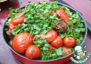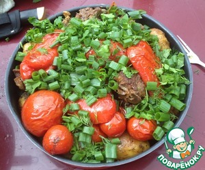 Раскладываем картошку по кругу, в центр выкладываем баранину, сверху помидоры и перец. Засыпаем зеленью! Блюдо готово! Приятного аппетита!