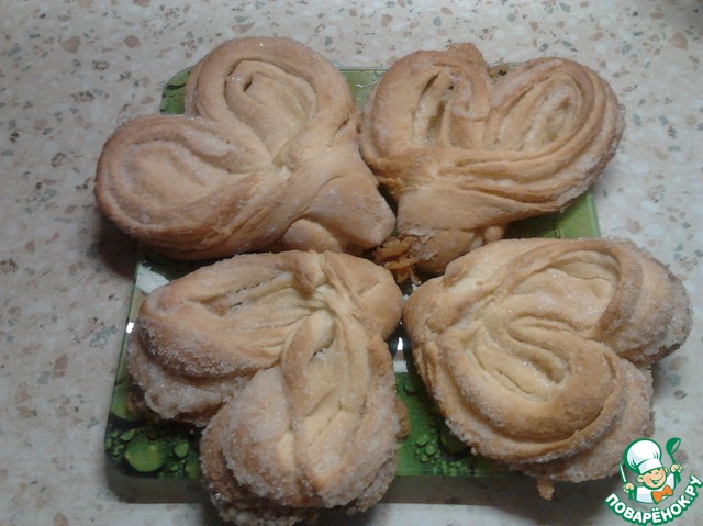 Раскатываем тесто в тонкую лепёшку, смазываем растительным маслом и посыпаем 1 столовой ложкой сахара. Сворачиваем тесто в плотную трубочку, защипываем у неё концы, делаем глубокий разрез, с противоположной стороны от защипа, ножом вдоль теста и разворачиваем в разные стороны. Полученную заготовку кладём на смазанный растительным маслом противень, придаём нужную форму и оставляем на 30 минут расстояться.