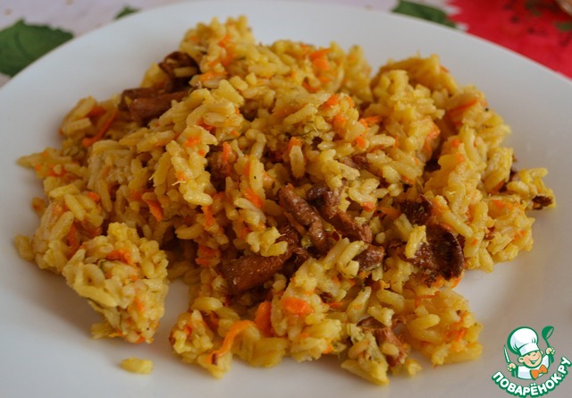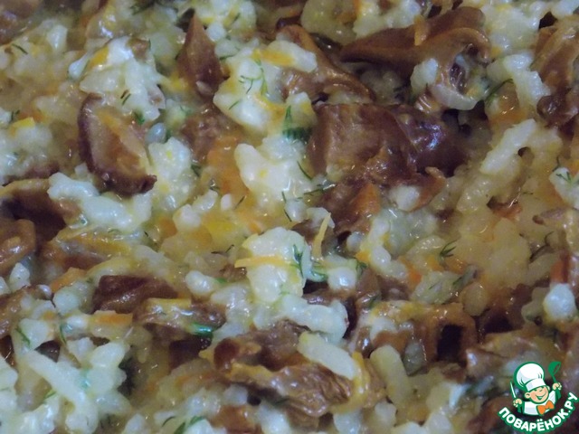 Теперь кладем мелко тертую морковь, лисички - все перемешать с рисом. Посолить и поперчить. Положить шафран и залить кипящим бульоном. Не мешая, закрыть крышкой и поставить в духовку при t= 180*С.