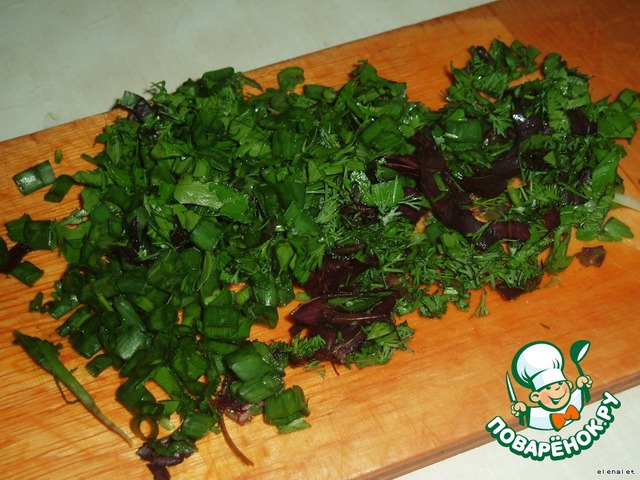 Порезать зелень. В оригинале рекомендовался зеленый лук, но я использовала лук, петрушку, укроп и базилик, так как очень люблю зелень.