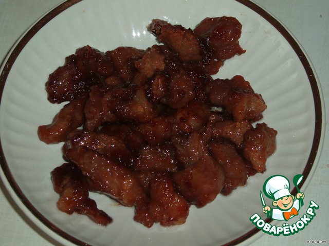 Обжарить кусочки свинины на сильном огне в течение 5 минут.