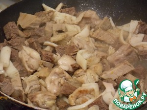 Курицу порезать на небольшие кусочки. На сковороде нагреть 2 ст. л. масла и обжарить на нем курицу примерно 10 мин. (до полуготовности ). Затем добавить нарезанные кубиком свинину и говядину. Кальмары полосками. Все добавить к курице. Закрыть крышкой и томить на медленном огне 10 мин.