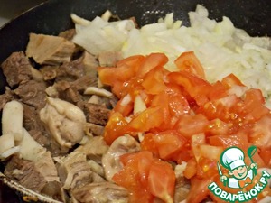 Добавьте мелко резанный лук и резанные, очищенные от кожицы, помидоры. Готовьте на медленном огне без крышки 10 мин. Снимите сковороду с огня.