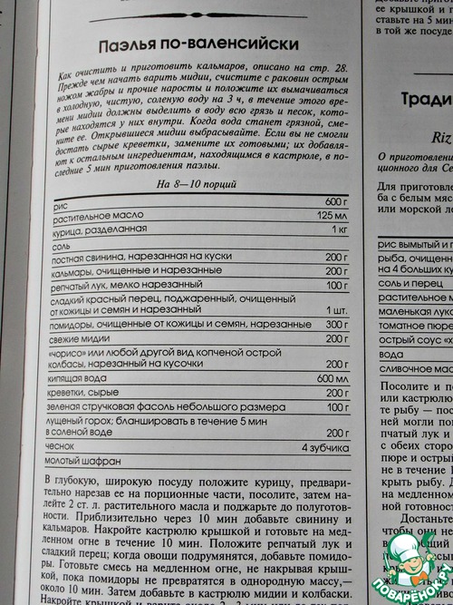 Почему почти? Потому что я отошла от оригинального рецепта от Victoria Serra из ее книги "Испанская кухня ". Если кому то будет интересен оригинал, то фото его будет в конце. Честно сказать, когда собиралась делать, было много сомнений по поводу совмещения мяса и морепродуктов. В моем понимание раньше, ну ни как они не сочетались. К моей радости, паэлья получилась настолько вкусной, что младший ребенок предпочел ее, а не тушеную картошку, которую он обожает.