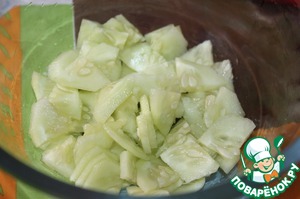 Огурцы нарезать тонкими кружочками, каждый кружок разрезать на 4 части. -