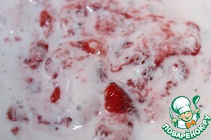 Оставшиеся ягоды клубники нарезать кубиками, соединить со сметаной, перемешать. Можно взбить блендером.