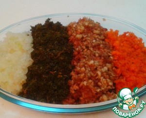 В мясопубку вставляем насадку с крупными отверстиями. 8 виноградных листьев замачиваем на 5 минут в кипятке. Виноградные листья+грибы+лук+мор ковь измельчаем. P.S. : После запаривания листья винограда потемнеют.