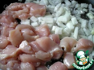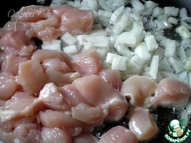 • Куриные грудки нарезать кубиками, обжарить вместе с мелко нарезанным луком и стручком ванили (если нет - используем ванилин) на оливковом масле до побеления.