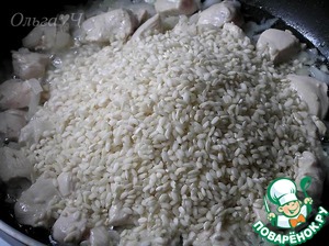 • Всыпать рис, готовить 1 минуту помешивая. Влить вино и выпарить.