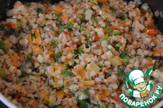 • Затем влить воду небольшими порциями, готовить помешивая около 20 минут, пока рис не впитает в себя всю жидкость.