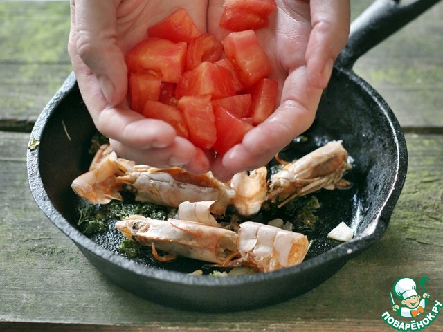 С креветок снять панцири и головы, добавить в сковороду. -