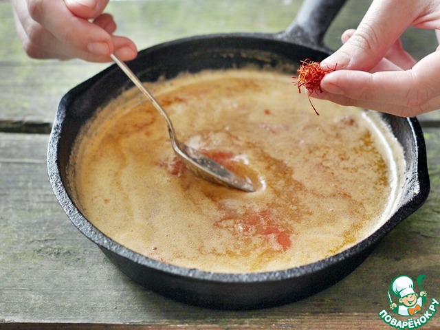 Добавить шафран, сразу перемешать и больше не прикасаться!