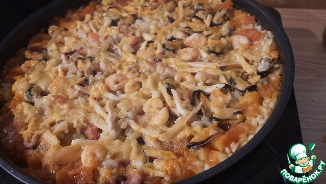 Примерно через 10 минут жидкость наполовину, даже больше, выпарится (на среднем огне), пришло время добавить "морской коктейль" - разложить по всей сковороде, чуть придавливая, но не перемешивать! (если нет "коктейля", это не страшно, благодаря бульону вкус уже будет очень насыщенный).