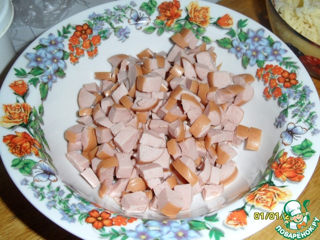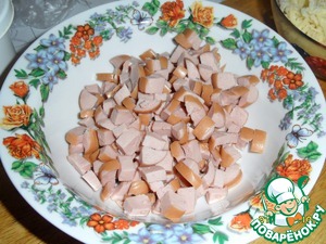 Режем сосиски, так же можно использовать любую вареную колбасу. -