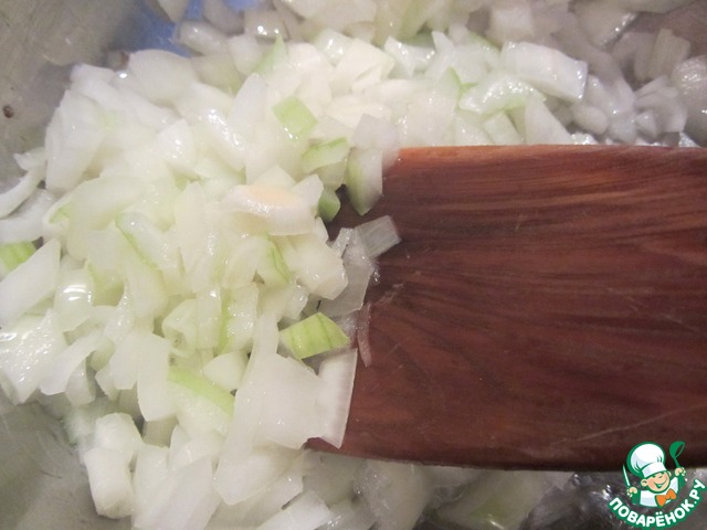В сотейнике разогреем масло и обжариваем лук, помешивая, 5 минут. -