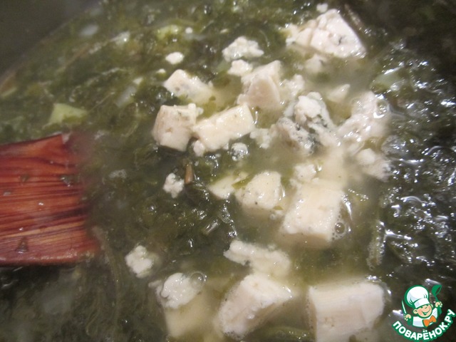 1. Можно на данном этапе оставить все как есть, выключить огонь и переходить к следующему шагу и подавать в дальнейшем с раскрошенным сыром. Так предлагалось в оригинале рецепта.