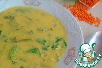 В оригинале рецепта предлагалось еще посыпать сверху колечками зеленого лука. Можете попробовать, мне не очень понравилось... Суп очень нежный и острота лука, мне так показалось, здесь не к чему.