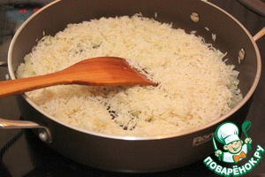 Лук почистить и мелко порубить. Разогреть в тяжелой кастрюле оставшееся оливковое масло и обжарить лук до прозрачности. Всыпать к луку рис, перемешать и немного прогреть. Влить горячий куриный бульон, накрыть крышкой и готовить на медленном огне.