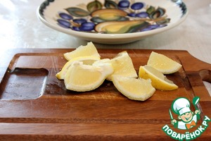 Вторую половинку лимона разрезать пополам. Поместить внутрь тушки все кусочки лимона.