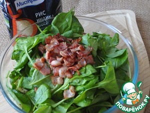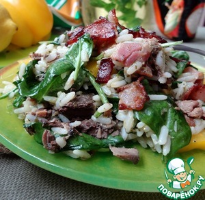 Это блюдо, в котором сочетаются рис, тунец, хрустящий бекон и мягкие листья шпината, заправленные нежным соусом песто, прекрасно подойдет для обеда в летнее время.