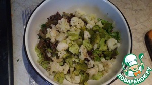 Отвариваем цветную капусту и брокколи, режем на соцветия поменьше и отправляем к зелени