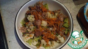Тушим печенку с луком и морковью ( я готовила в пароварке 40 минут, выложила в чашу для риса печенку, сверху лук и морковь, добавила чуть-чуть воды) но если нету времени или пароварки- просто обжариваем печенку с луком и морковью