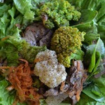 Солим, перчим, я добавила немного соевого соуса, так же я добавила немного той воды что осталась после готовки печенки, ато боялась что суховато будет. Получается большие две или три поменьше порции. Уже готовые порции заправила ( полила) оливковым маслом. Получилось очень вкусно и сытно! Печенка- один из продуктов с найбольшим содержанием белка, по этому БЖУ тут выдержано (!) Этот салат вкуснее, когда он теплый, но когда " остынет" так же вкусно.