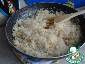 Тем временем готовы лук и чеснок, добавляем в сковороду рис и перемешиваем. Рисинки под действем масла становятся прозрачными и очень красивыми.