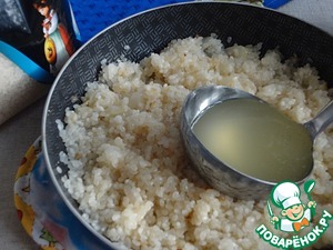 Влейте пару половников горячего бульона. Готовьте пока рис его не впитает. Вливайте понемногу бульон еще 2-3 раза. Постепенное вливание жидкости помогает рису не слипаться. Мне очень нравится процесс приготовления ризотто. Забавно наблюдать стадии "взросления" рисинок.)))