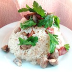 Почти классический, "миланский" вариант ризотто, обогащенный вкусовыми добавками в виде грибов и бекона.