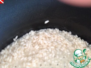 Всыпаем рис (я взяла классический рис для приготовления ризотто сорта Арборио), перемешиваем.