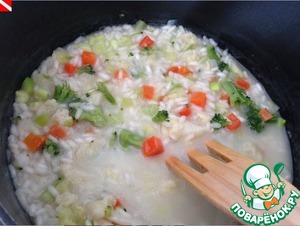 Когда впитается вторая часть бульона, можно добавить приготовленные нами овощи и еще 200 мл бульона. Мы уже знаем в какой момент)))