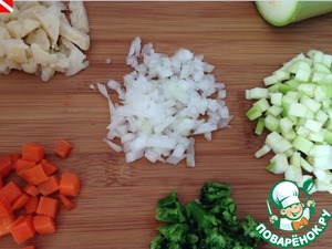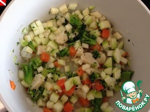 Сначала подготовим и нарежем мелким кубиком овощи - лук, морковь, кабачок, брокколи и цветную капусту.