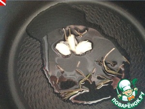 Приступаем к приготовлению самого ризотто. На оставшемся разогретом оливковом масле слегка обжариваем раздавленный зубчик чеснока и веточку розмарина. Далее они нам не понадобятся.