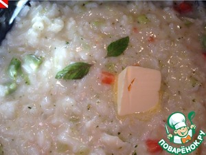 Сейчас рис уже почти готов, al dente, как говорится. Добавляем натертый сыр, листики базилика и сливочное масло. Если получается слишком густо допускается влить немного воды, чтобы расслабить ризотто. Как мне объяснили знатоки европейской кухни, ризотто не должно сидеть в тарелке, оно должно ее наполнять (перевод дословный).